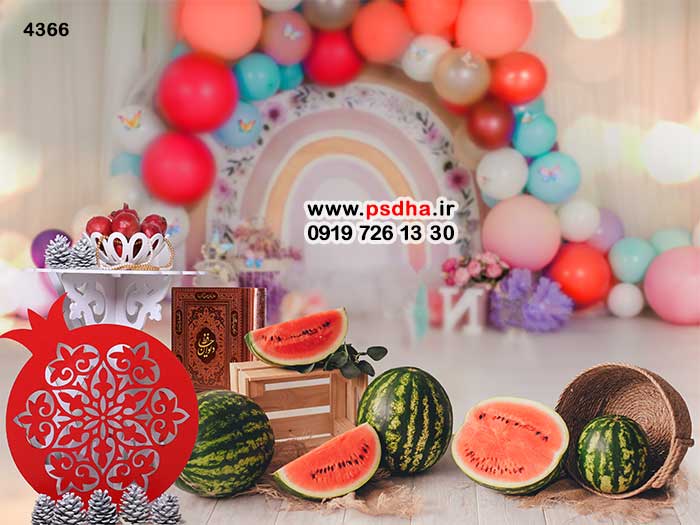بک گراند لایه باز یلدا ، با دکور استند انار ، دیوان حافظ ، هندوانه ، انار با پس زمینه ی وایت روم آتلیه برای عکس های قدی بزرگسال و کودک